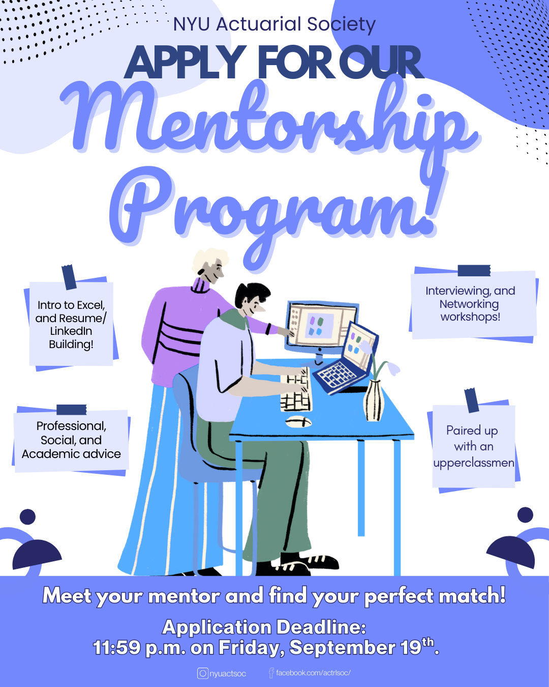 The mentors have experience with Stern coursework and can give advice on how to build a schedule that will help mentees to gain the skills needed to have a successful career in actuarial science. Our mentors have also successfully passed actuarial exams, and can provide insight on study strategies.
